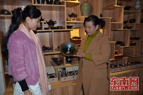 建盞傳承人之闕梅嬌 梅花朵朵笑春風 隨著建盞文化的傳播,建盞受到了大家的關注,建盞產業迎來了復興的春天。厚積薄發,闕梅嬌的建盞事業如花兒精彩綻放。 闕梅嬌的建盞作品風格多變,時而溫潤典雅,時而質樸簡約,時而華麗大方。油滴盞造型古拙、胎體厚重、釉色瑩潤;窯變釉面五彩斑斕、瑰麗悅目;茶盞造型圓潤、華貴,讓人愛不釋手。2011年,她的福建省建陽建窯陶瓷研究所被建陽市政府確定為"文化產業示范基地";2014年,她的建盞作品分別獲得中國工藝美術"百花獎"金獎、第九屆海峽工藝博覽會金獎;2015年,她榮獲福建省工藝美術大師稱號,南平市非物質文化遺產代表性傳承人(建窯建盞制作技藝)。她的建盞作品還被廈門博物館等多家博物館收藏。 闕梅嬌認為,建盞的花紋是在燒制的過程中自然形成的,巧奪天工、獨一無二。建盞的美,是一種道家"無為而治"的美。由此,她堅持遵循古制,純手工、純灰釉、不添加礦物質,通過提高自身技藝,提升自身的藝術修,進一步完善建盞的品質。為了讓自己的產品在激烈的市場競爭中獨樹一幟,闕梅嬌為自己的產品申請"御兔牌"商標并于2013年4月獲得批準,有效期20年,同時她還在自己的作品打上"闕"字款。這些"品牌"措施讓闕梅嬌的產品始終保持高價位熱銷,一支獨秀。 手指在手機上靈活移動,拍照、上傳、講價,不到5分鐘,一筆建盞銷售訂單就談成了。這位巧手的80后美女就是闕梅嬌的獨生女兒肖艷,她是闕梅嬌笑傲商場的"秘密武器"。闕梅嬌有80%的建盞產品是女兒通過網絡銷售。80后的肖艷不僅在銷售領域做得風聲水起,建盞的制作技藝比起母親來也毫不遜色。她制作的建盞作品《鷓鴣斑油滴斗笠盞》曾獲2015年中國工藝美術"百花獎"優秀獎 ;"宇宙星空銀斑油滴盞"被南平市博物館收藏。年輕的肖艷認為,在建盞制作中,要堅定不移走高端的復古路線,要將最原汁原味的建盞藝術呈現給大眾。 "高鐵時代,建陽建盞產業迎來發展新機遇。"闕梅嬌說。2014年,母女倆在建盞文化條一條街開設建盞門店;2016年1月,占地13畝,集精品展示、陶藝制作體驗、歷史文化等為一體的陶瓷文化創意園將破土動工。這支傲雪寒梅,憑借著智慧和毅力,盛放著自己的燦爛和美麗。 □張敏英 丁曉雄 |