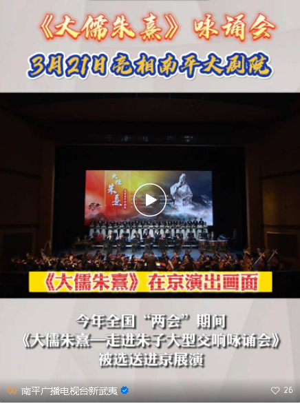 今年全國“兩會”期間 《大儒朱熹——走進朱子大型交響詠誦會》 就被選送進京展演 全網(wǎng)傳播人次破1.5億 集中展現(xiàn)了南平近些年 加強朱子文化精品創(chuàng)作的 最新成果 ↓↓↓
