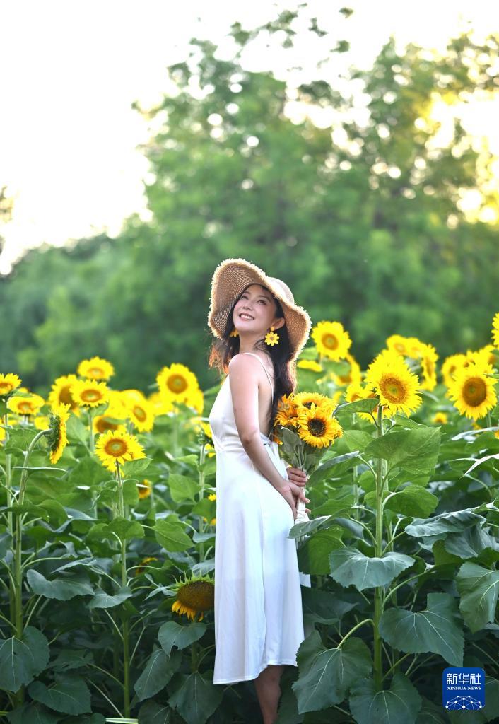 7月5日,游客在北京奧林匹克森林公園北園的向日葵花田中留影。 盛夏時節(jié),北京奧林匹克森林公園北園的向日葵迎來最佳觀賞期,吸引眾多市民游客前來觀賞。 新華社記者 陳曄華 攝