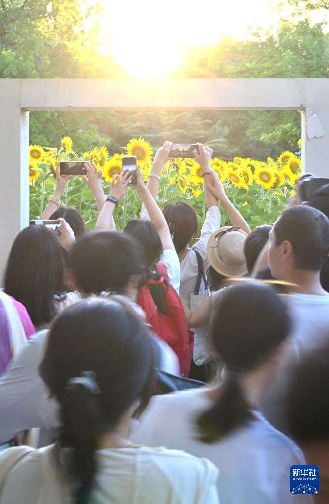 7月5日,游客在北京奧林匹克森林公園北園觀賞盛開的向日葵。 盛夏時節(jié),北京奧林匹克森林公園北園的向日葵迎來最佳觀賞期,吸引眾多市民游客前來觀賞。 新華社記者 陳曄華 攝