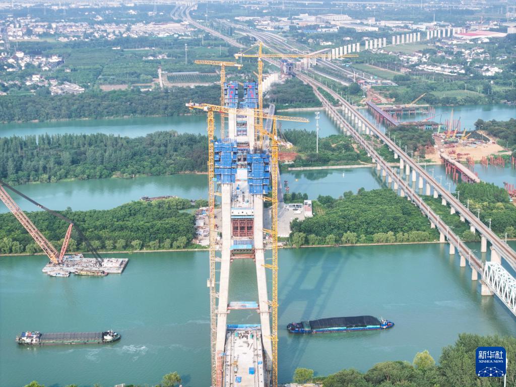 這是滬渝蓉高鐵跨京杭運河斜拉橋施工現場(7月13日攝,無人機照片)。 近日,由中國鐵建大橋局承建的滬渝蓉高鐵跨京杭運河斜拉橋主橋兩岸鋼混段架設順利完成,大橋主橋上部結構施工轉入鋼梁懸臂拼裝階段,主塔建設已完成90%。據悉,該橋位于江蘇揚州境內,是滬渝蓉高鐵全線關鍵控制性工程,橋長564.3米,主跨300米。 滬渝蓉高鐵是國家“八縱八橫”高鐵骨干通道之一,線路總長約2100公里,設計時速350公里。 新華社記者 季春鵬 攝