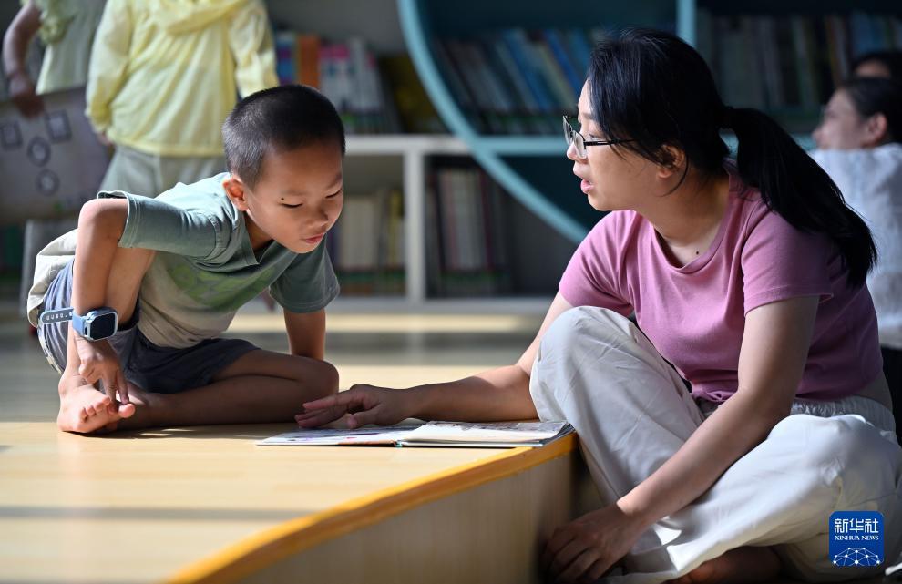 8月3日,家長帶著孩子在位于海口市的海南省圖書館讀書。