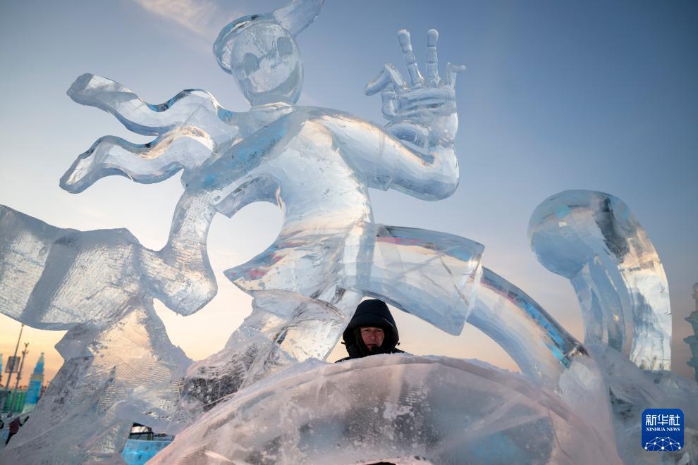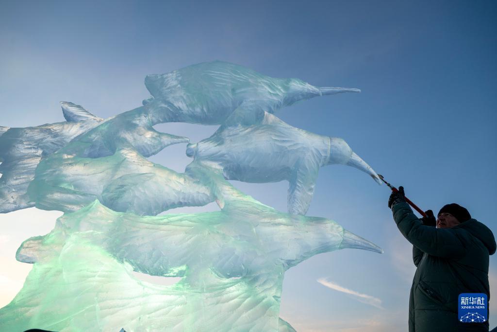 1月3日,參賽選手在哈爾濱冰雪大世界園區(qū)內進行冰雕創(chuàng)作。 1月3日,在哈爾濱冰雪大世界進行的第37屆中國·哈爾濱國際冰雕比賽進入第二天賽程,來自12個國家的76位選手在嚴寒中精雕細琢,參賽作品已芳容初現。 新華社記者 張濤 攝