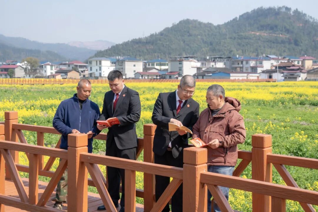 位于福建省南平市建陽區麻沙鎮的長坪村,是當地水稻、再生稻、油菜花“一田三熟”栽培模式的核心示范片,三月春至,千畝油菜花迎風綻放,建陽區人民法院的法官們把法庭搬進稻田花海間,就地化解一起因去年水稻種植回收引發的糾紛,奏響司法助農“調和曲”。